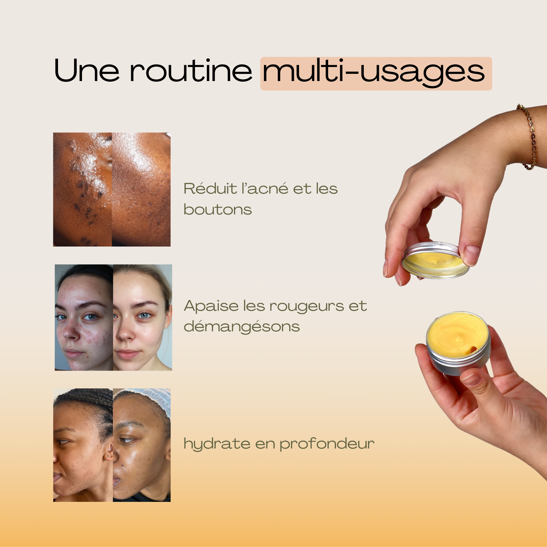 Peaux sèches : Le baume du soir nourrit profondément, tandis que le baume du matin hydrate.